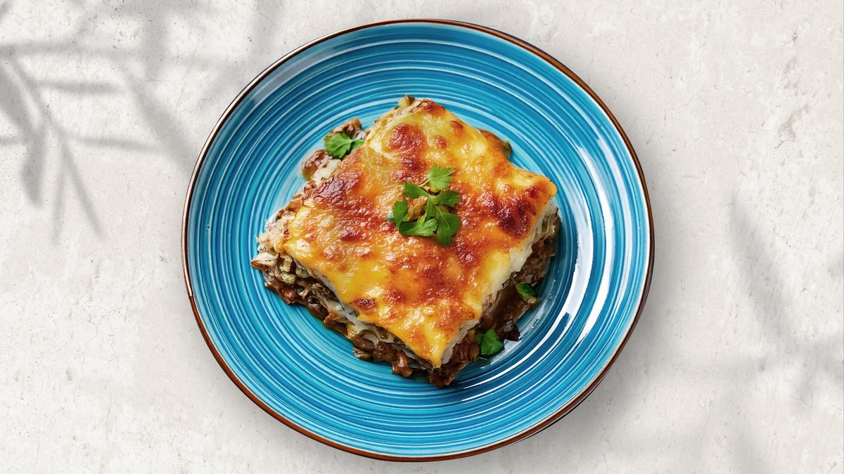 Zapečené hovězí mleté maso s rajčaty, lilky, bramborami a bešamelem