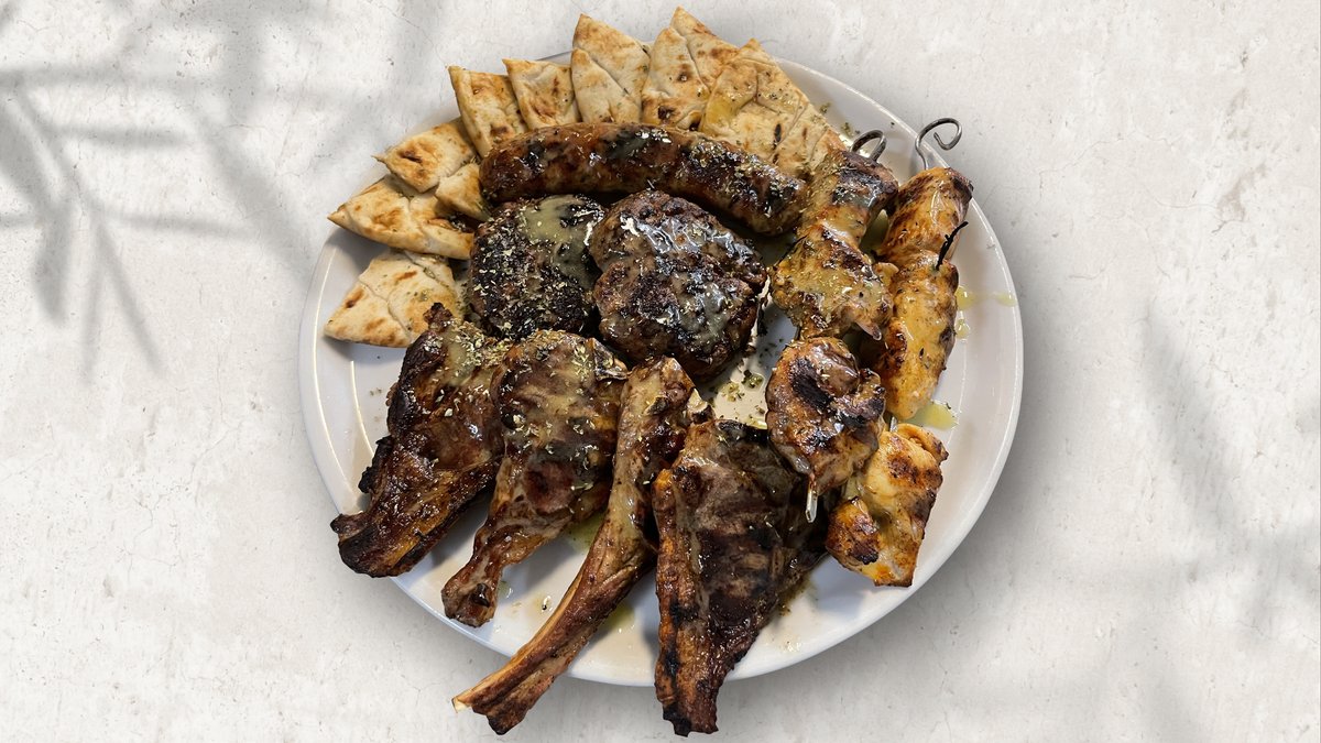 Kuřecí (150g) a vepřové špízy (150g), karbanátky (150g), jehněčí kotlety (100g), tradiční klobása (50g)