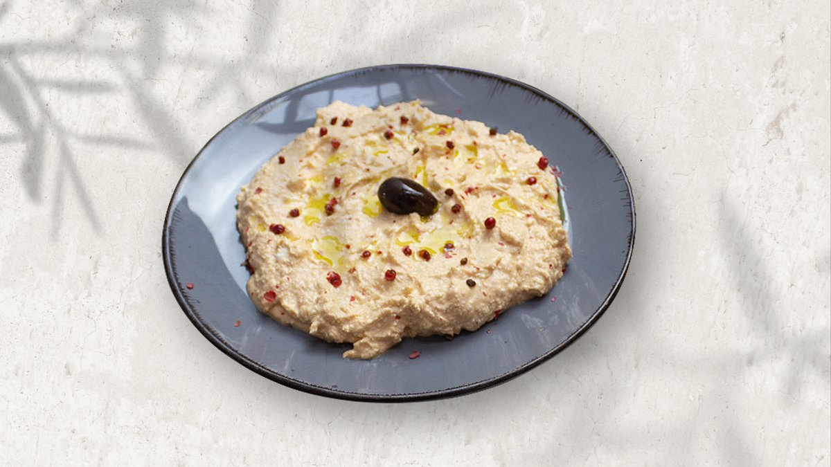 Pasta ze žlutého hrachu, marinované ančovičky, krájená rajčata, jarní cibulka a kurkuma