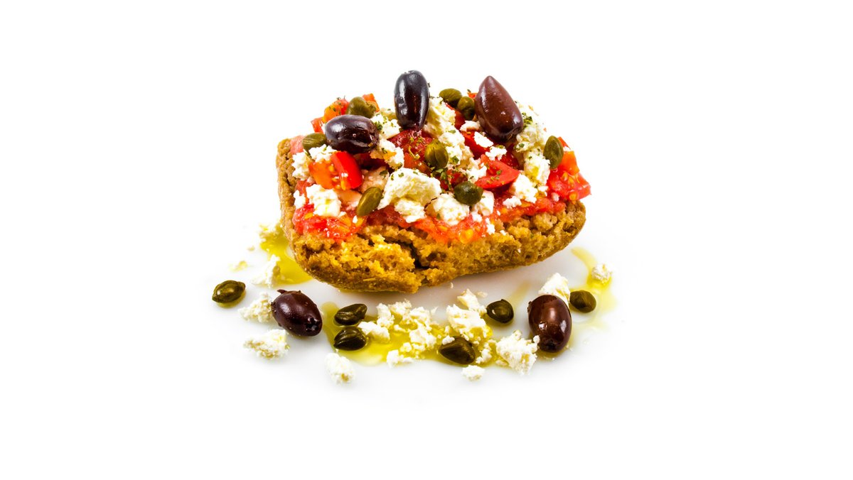 Ječný suchar s čerstvými rajčaty, olivovým olejem, sýrem feta, oreganem a česnekem