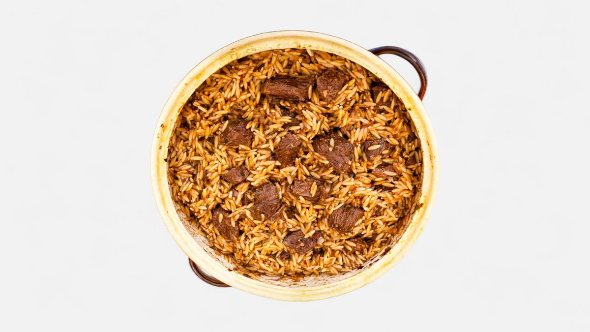 Těstovinová rýže vařená s hovězím masem a sýrem graviera v domácí rajčatové omáčce
