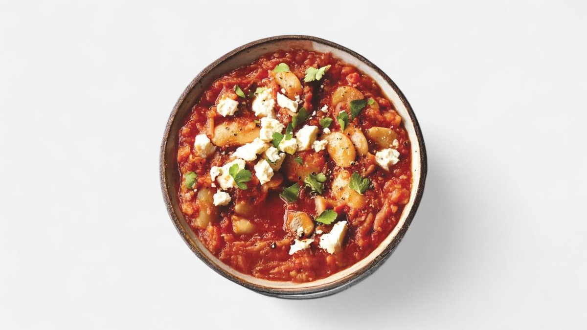 Velké fazole z Prespes pečené v troubě se sýrem feta, oregánem a olivovým olejem