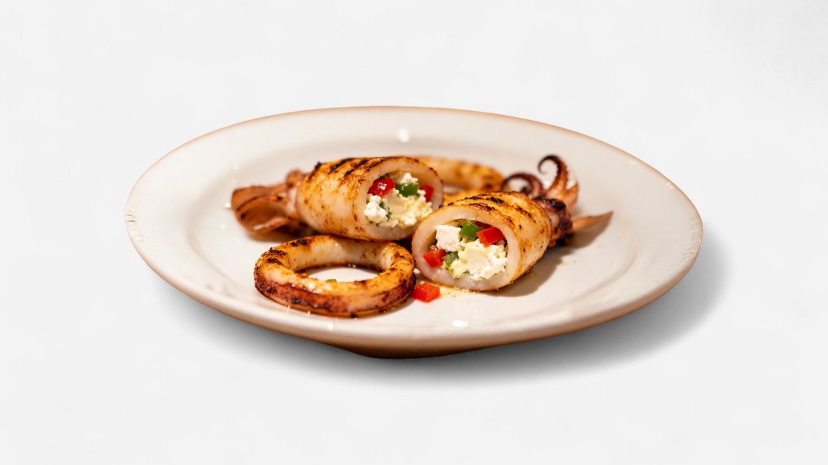 Grilovaný kalamár plnený paprikou a sýrem Feta