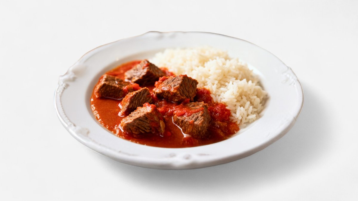 Dušené hovězí na rajčatech s pomerančem, podávané s rýží