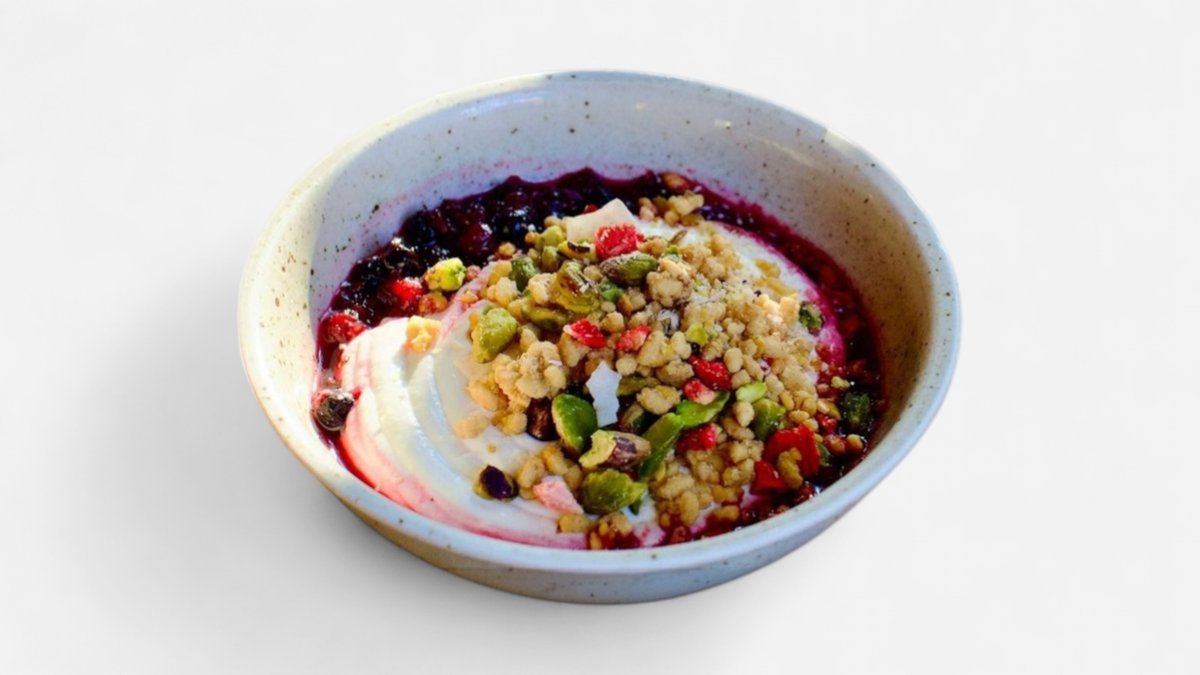 Vafle s mascarpone, lesním ovocem a pistáciovou granolou