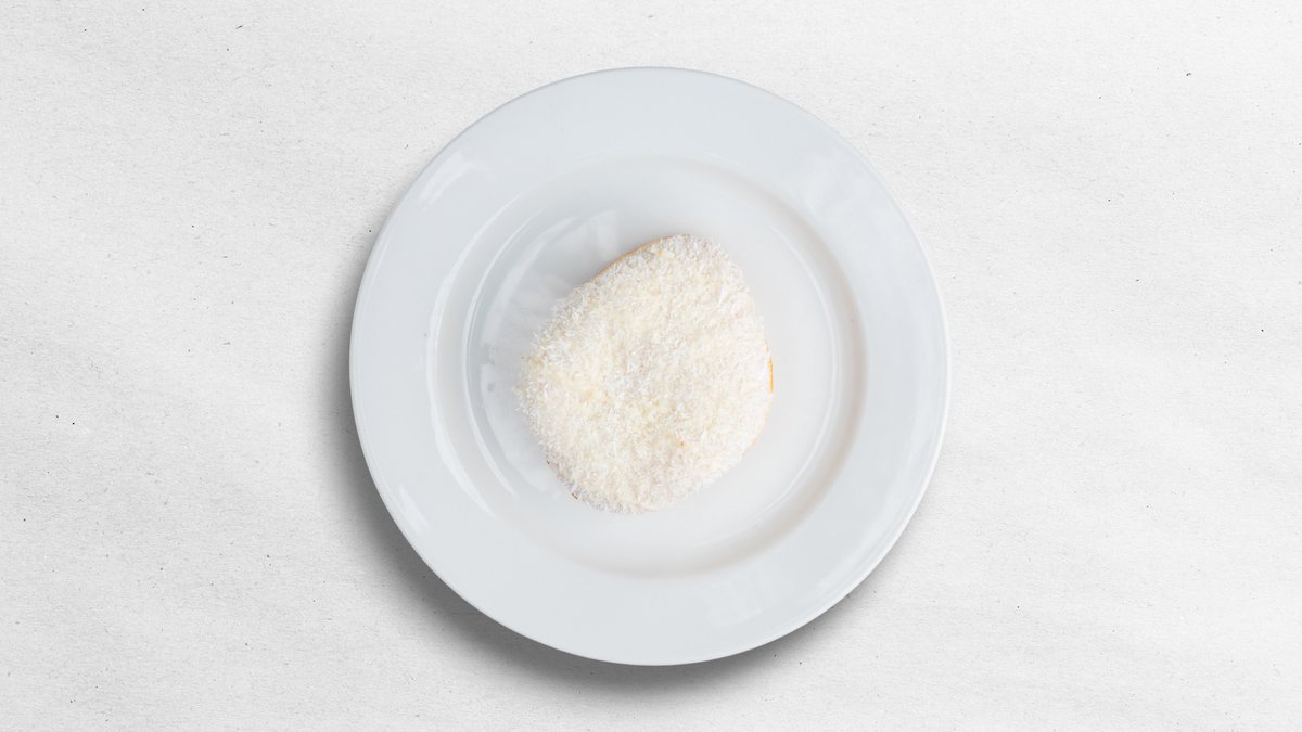 Donut s polevou z bílé čokolády, posypaný kokosem s kuličkou Raffaello