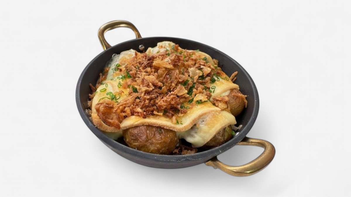 Gratinované grenaille sýrem Raclette, karamelizovaná cibulka, křupavá cibulka