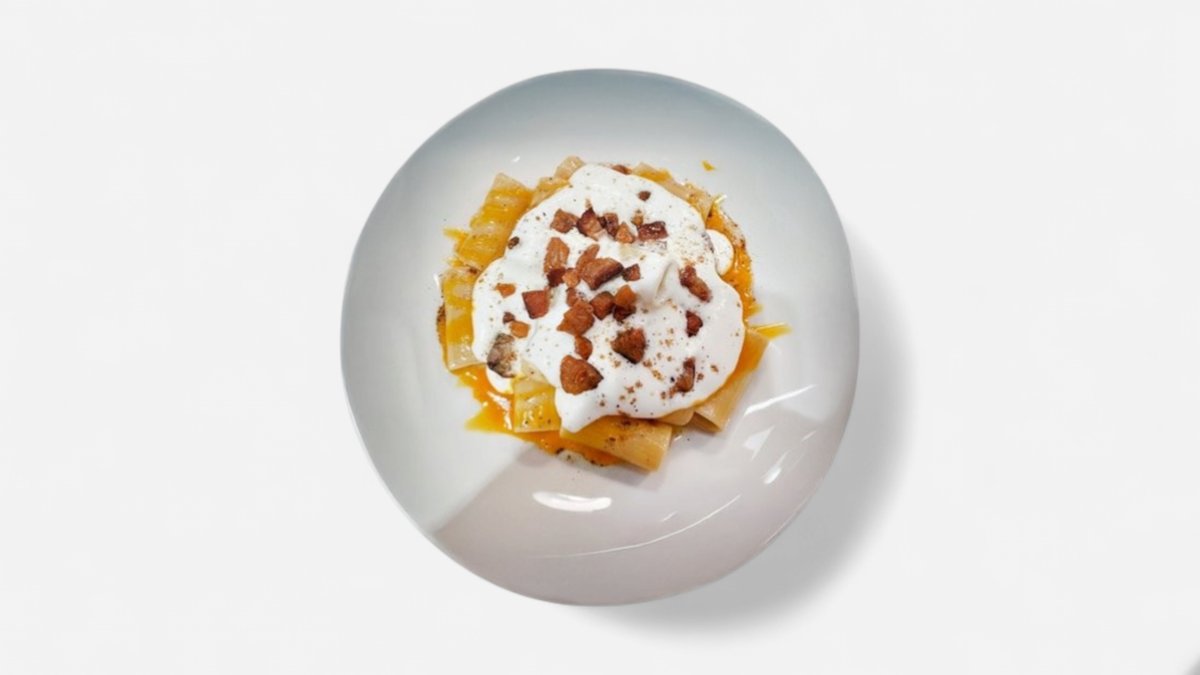 Rigatoni, guanciale, konfitovaný žloutek, pěna z parmezánu