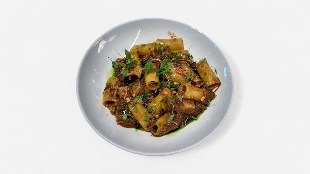 Rigatoni s trahným hovězím žebrem, petrželový olej, parmezán