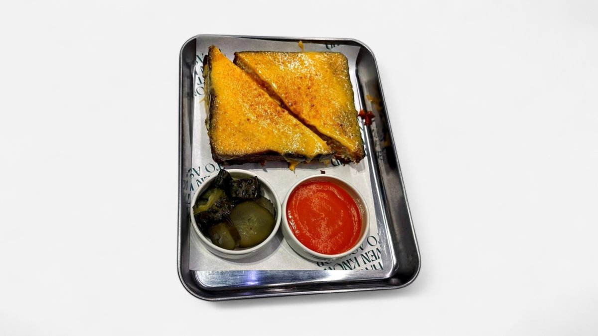 Náš kváskový toustový chléb, máslo, cheddar, brie, gruyere, nduja, paprikový kečup, naše kvašáky