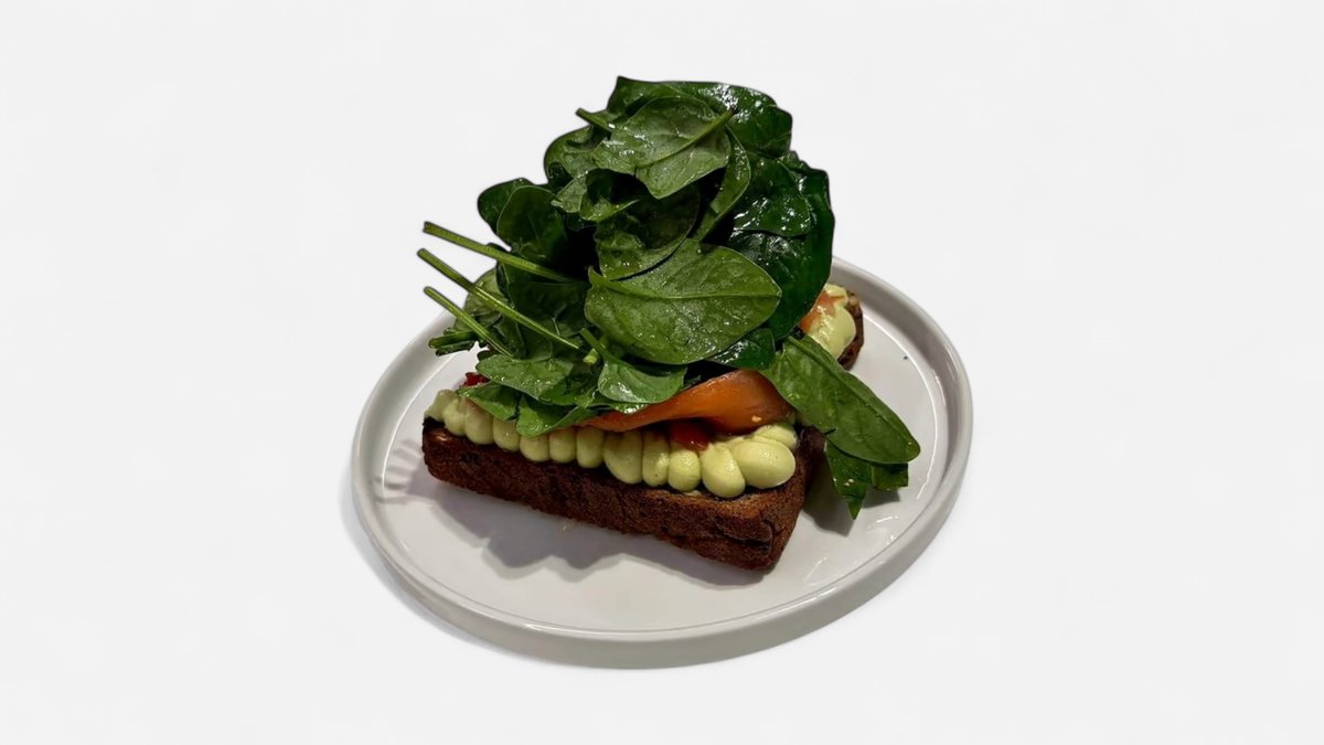 Domácí žitný chléb, uzený losos, avokádo, rajčatový reliš, baby špenát, umami pepř, pošírované vejce