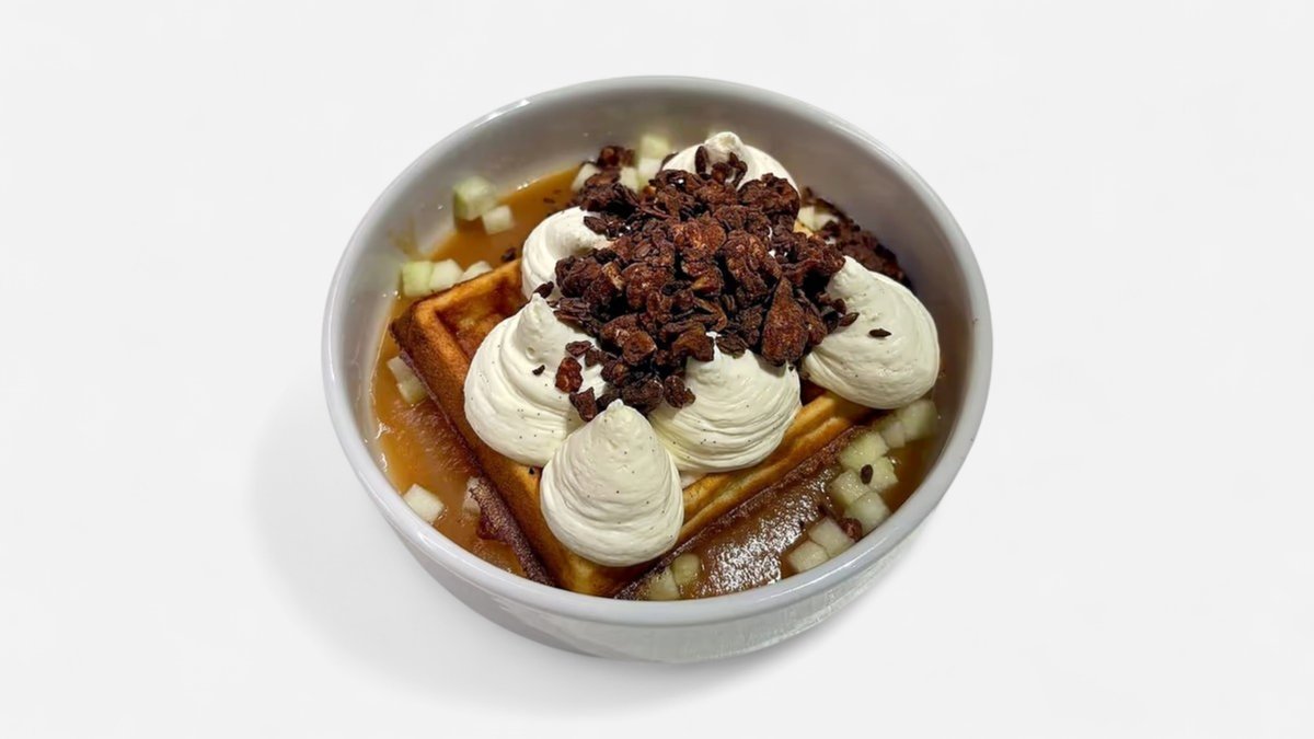 Vafle, jablečné pyré, marinovaná kyselá jablka, granola s vlašskými ořechy, mascarpone s vanilkou