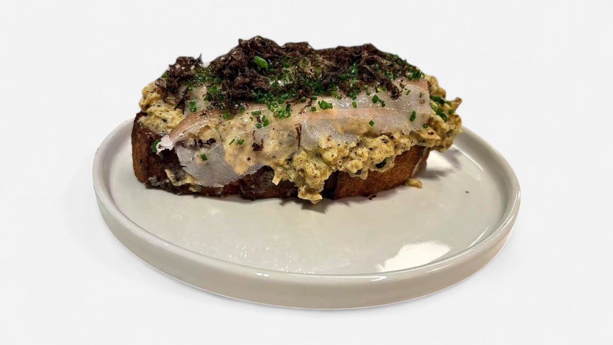 Náš toustový brioš chléb, hovězí pastrami, brie, černý lanýž, rukola, hořčicová majonéza