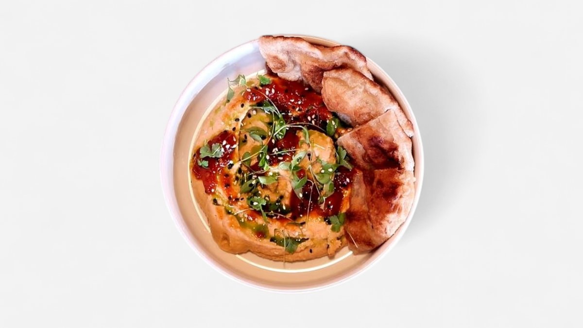 Hummus z cannellini fazolí, kvásková placka, rajčatové chutney, sezam, jarní cibulka