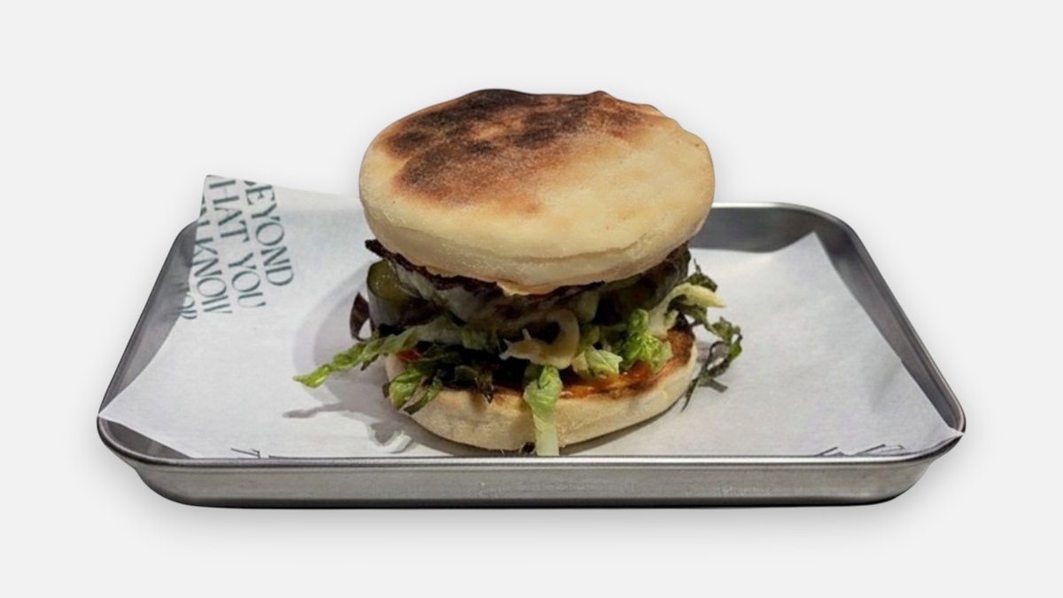 Anglický mufin, grilovaná placka 100% hovězí, hash brown, blaťácké zlato, paprikový kečup, hořčice, salát