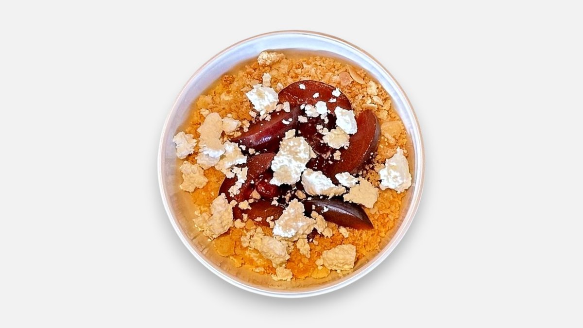 Mléčná rýže, švestkový džem s hřebíčkem a skořicí, nakládané švestky, mandlová drobenka, strohaný tvaroh