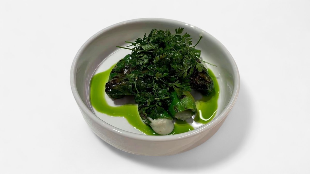 Plněné padrone papričky modrým sýrem, omáčka vinagrette, kerblík