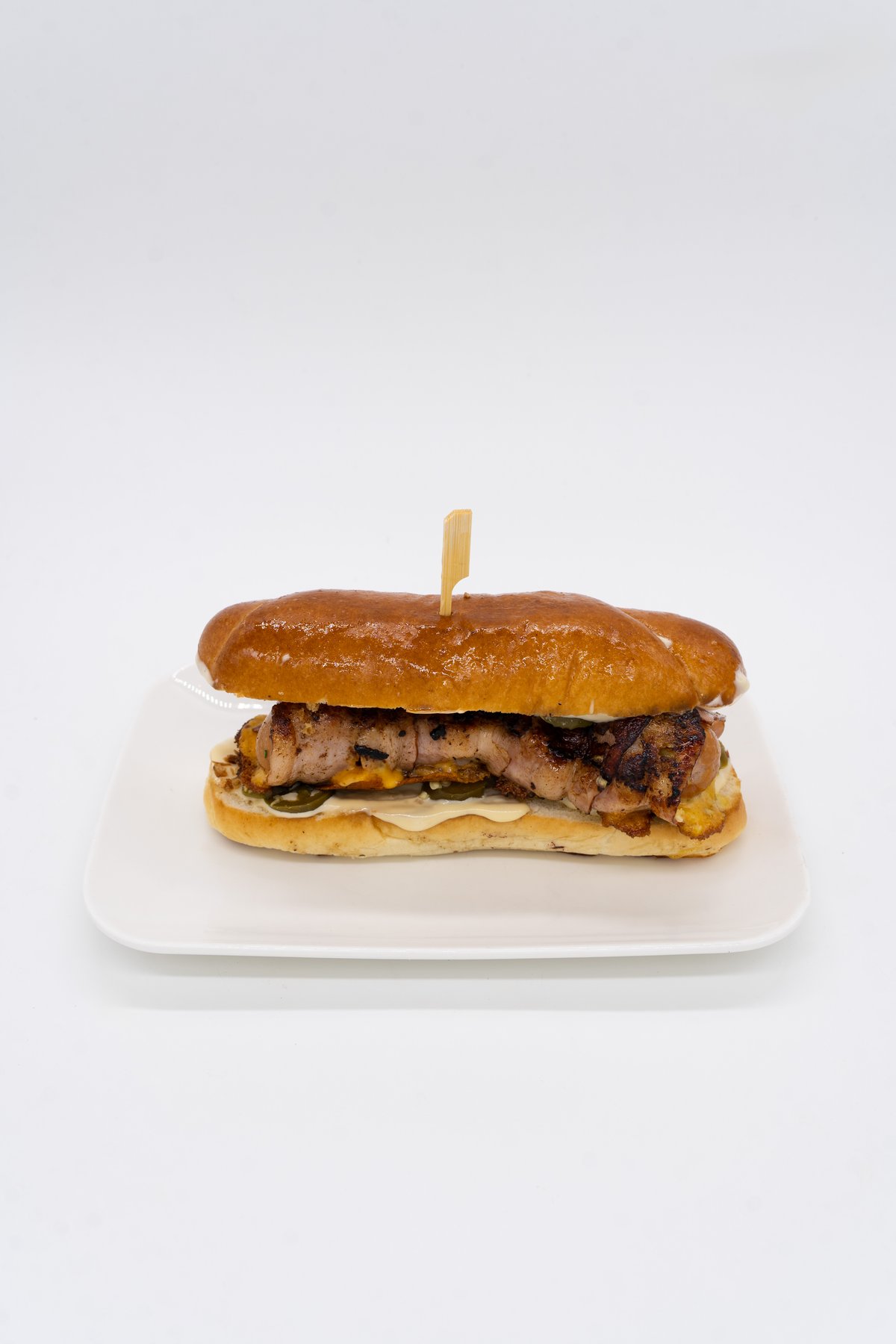 Domácí ručně dělaný hot dog s čerstvou brioškou zabalený do slaniny, čedar, jalapeños, domácí dresink, sušená cibulka