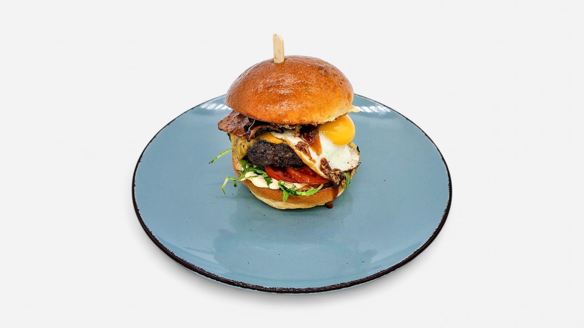 Hovězí maso, domácí dresink, Jack Daniel's BBQ dresink, vejce, slanina, čedar, smažená cibulka, rajče, rukola