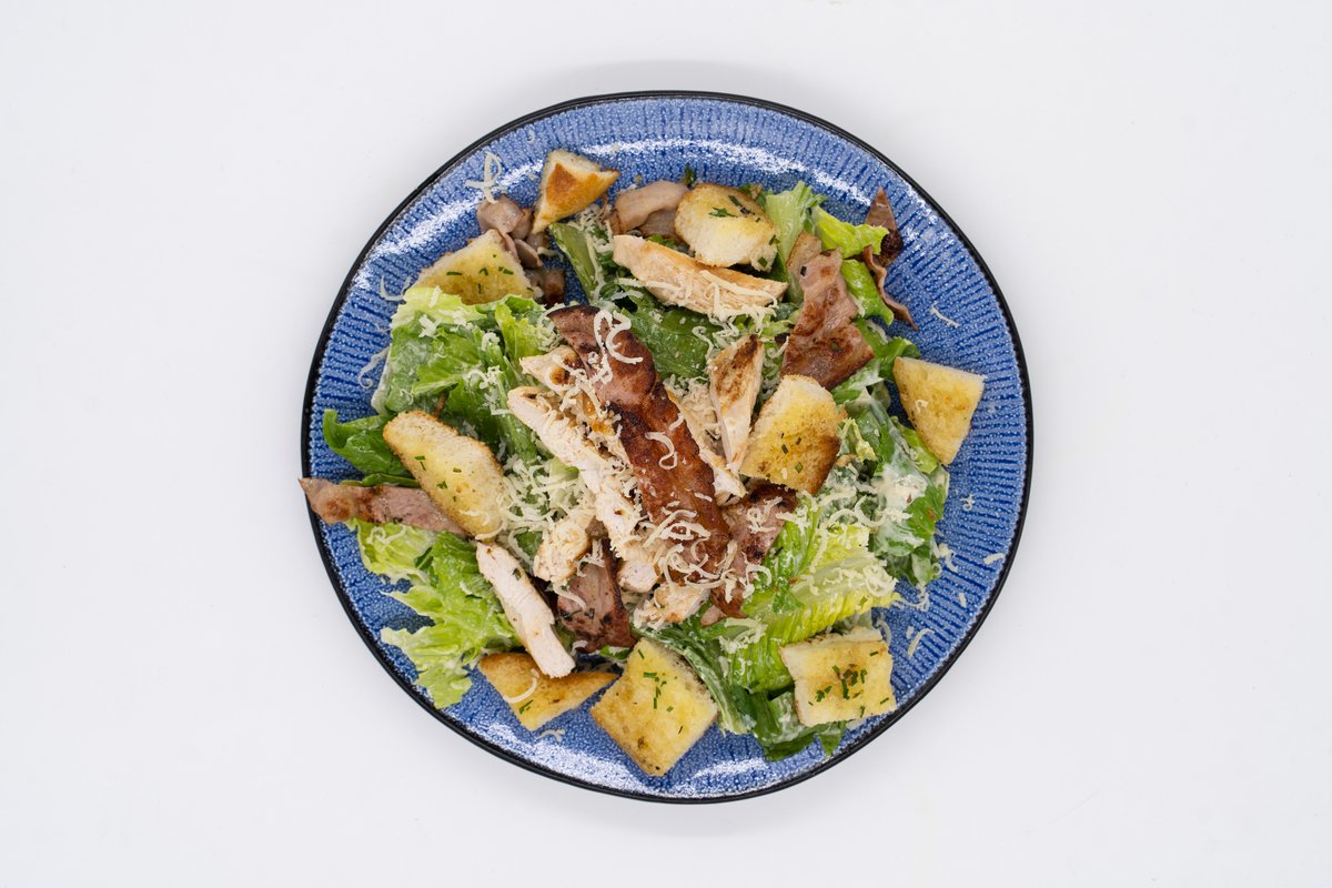Kuřecí prso, římský salát, domácí dresink, slanina, bylinkové krutony, parmezán