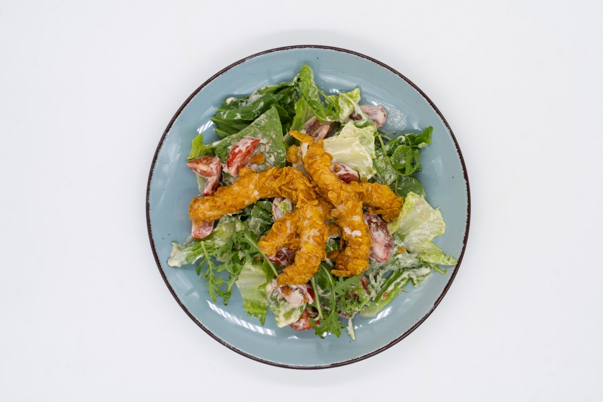 Kuřecí nugetky v kukuřičných lupínkách, římský salát, rajčata, rukola, domácí dresink