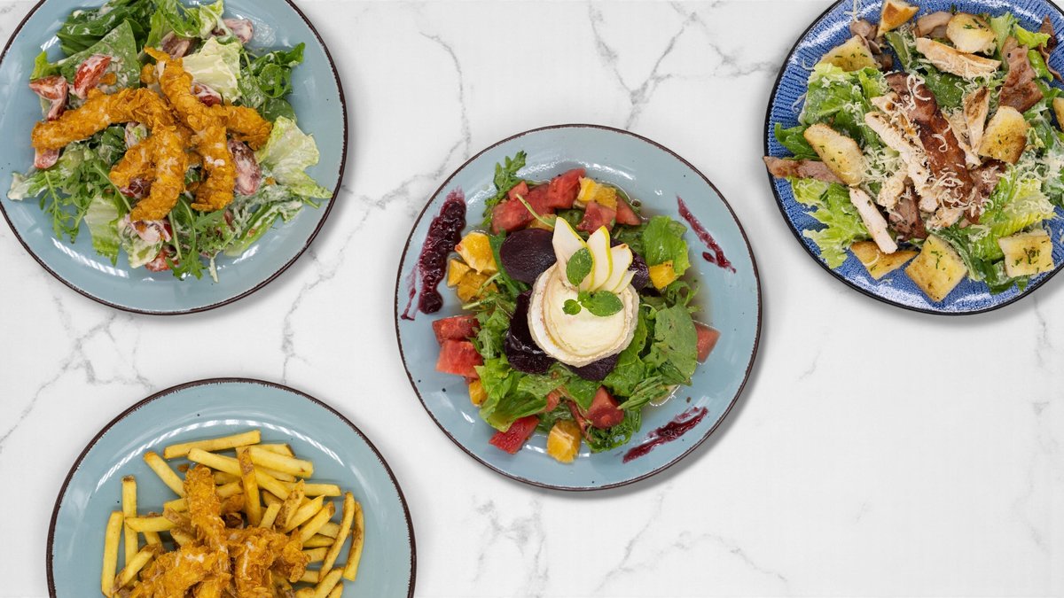 Rozpečený kozí sýr, římský salát, rukola, medovo-hořčičný dresink, marinovaná řepa, med, sezónní ovoce