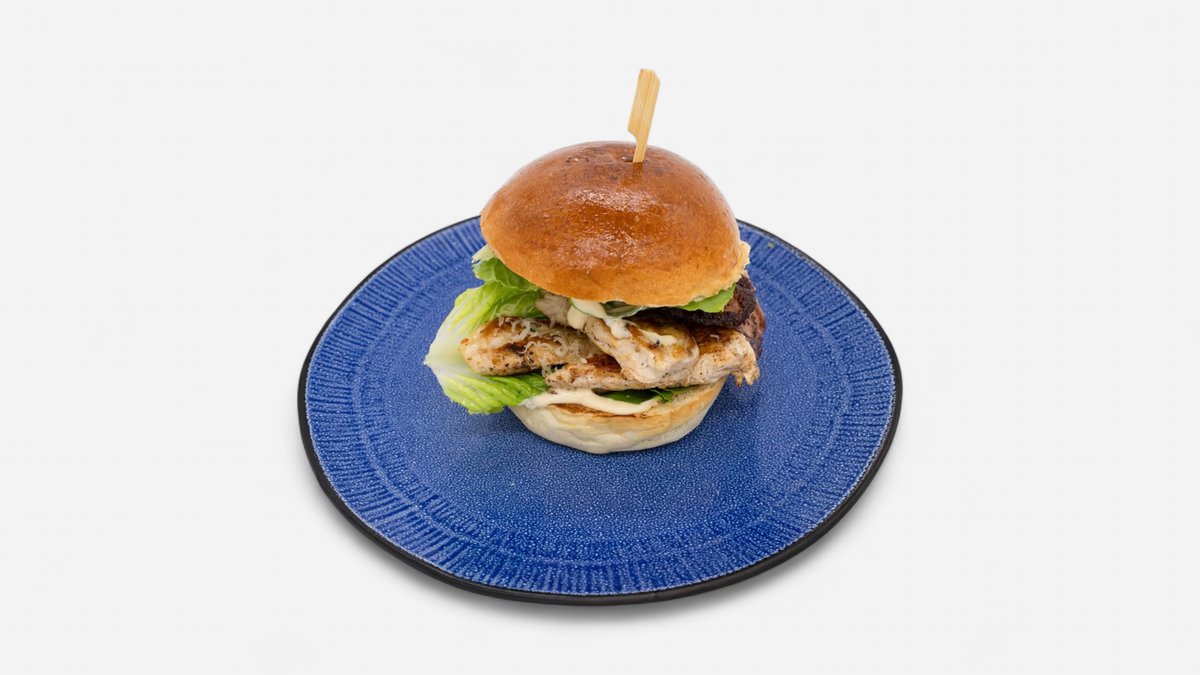 Hovězí maso, domácí dresink, čedar, rajče, salát, sýr s modrou plísní, slanina, cibuláda