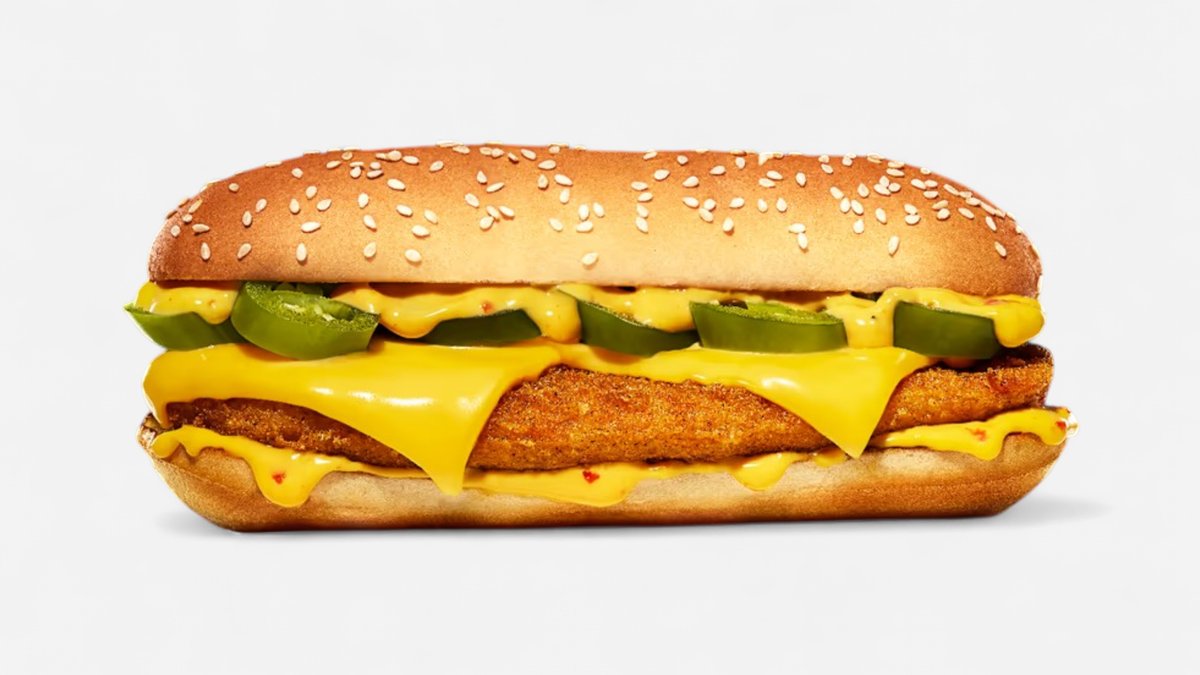 Tři plátky na ohni grilovaného hovězího masa s roztaveným sýrem čedar, pálivou chilli omáčkou a pikantními jalapeños. V menu se středními hranolkami a nápojem.
