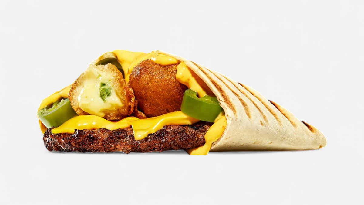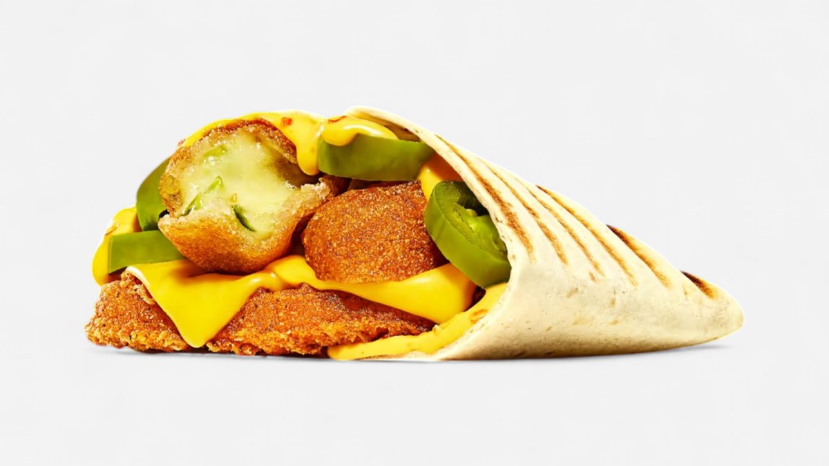 Na ohni grilovaný rostlinný plátek s lahodnou Teriyaki omáčkou, doplněný sýrem Cheddar, červenou cibulkou, čerstvým polníčkem a okurkou, to vše zabalené do tortilly. Křupavý zážitek s nádechem Asie. V menu se středními hranolkami a 0,3l nápojem.