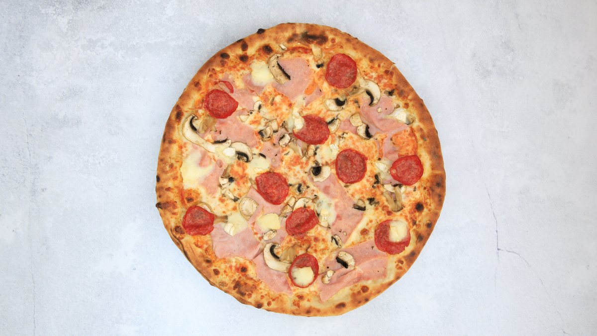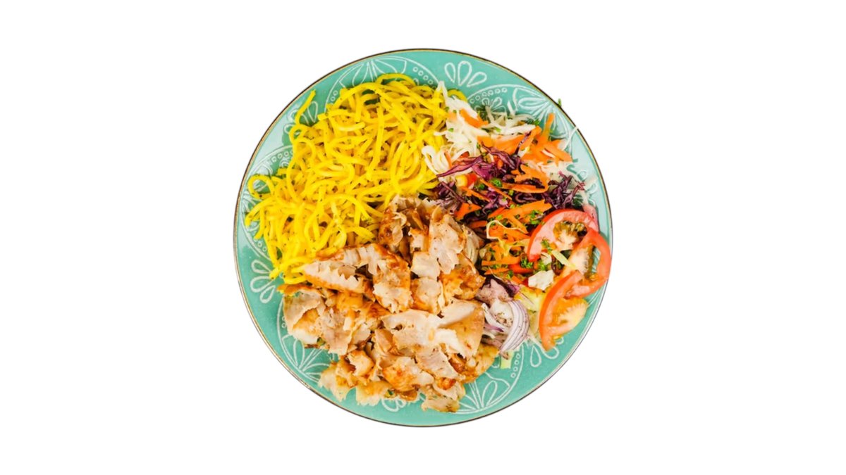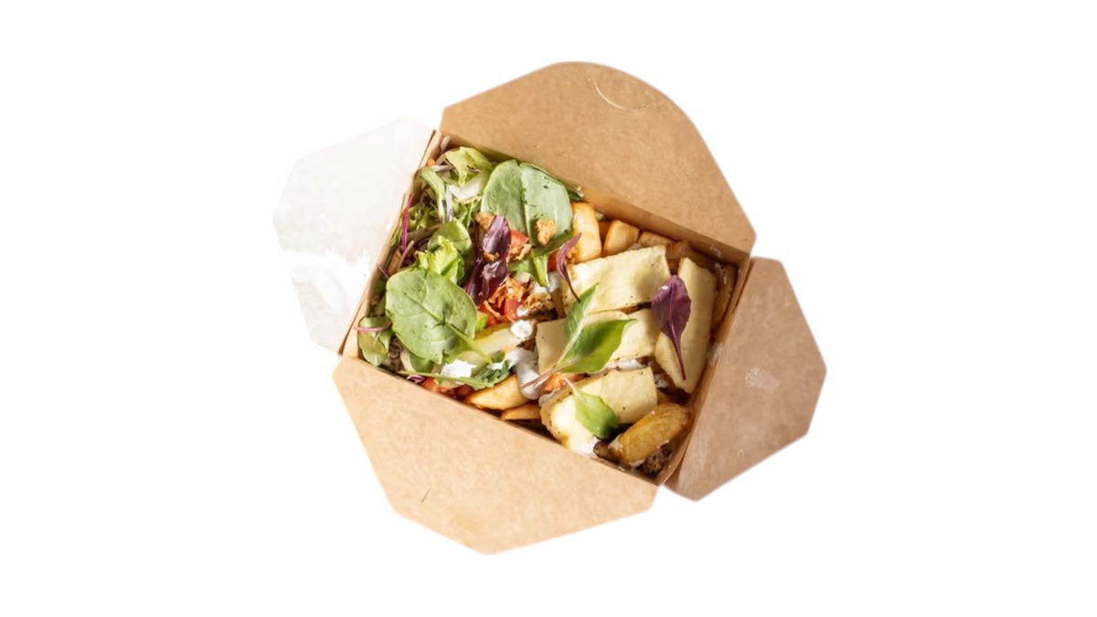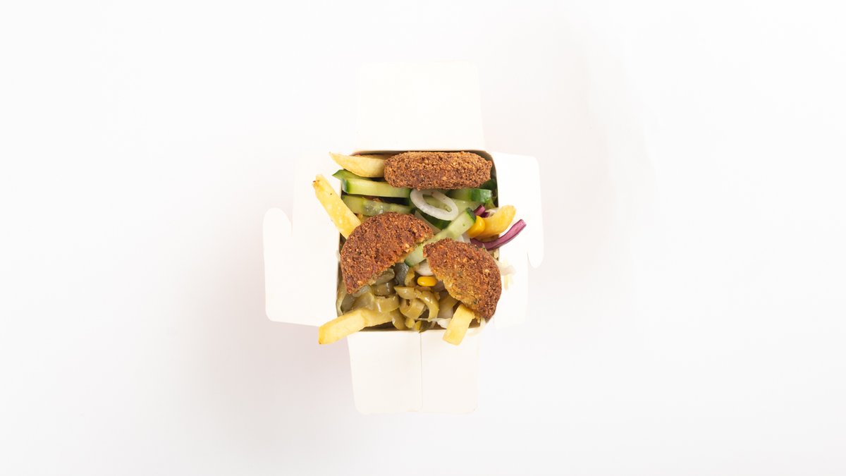 maso, salát, sýr, olivy, feferonky, hranolky, dresink