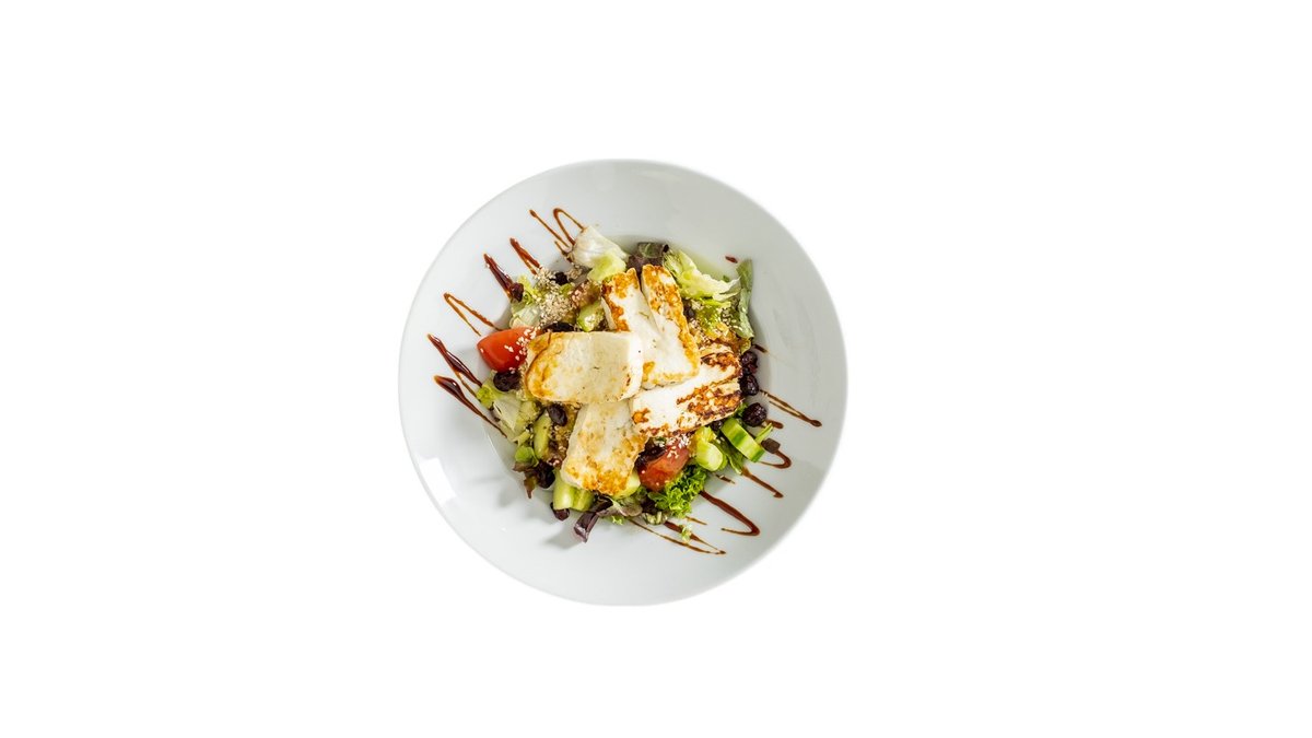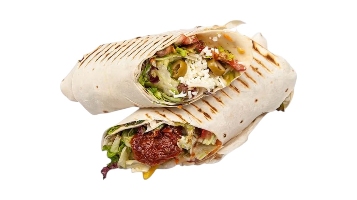 mix salát, sýr, olivy, feferonky, tortila, dresink