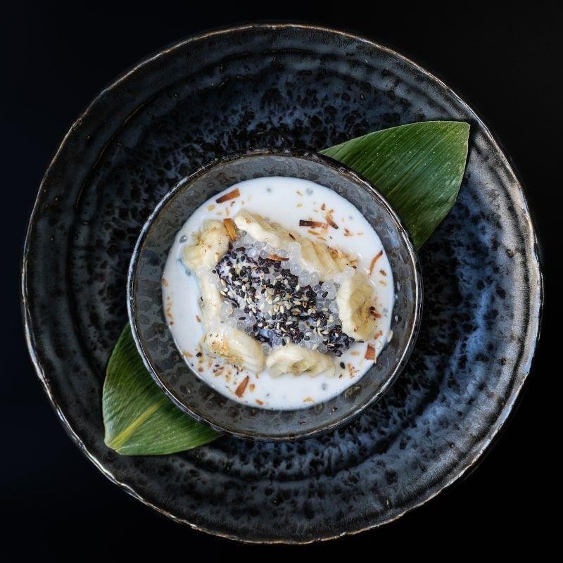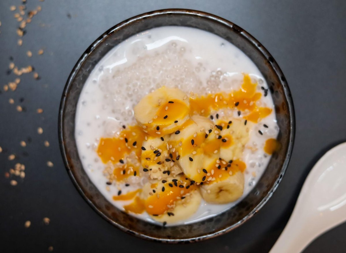 Tradiční thajský dezert: banán povařený v kokosovo-medovém mléce s tapiokovými kuličkami a sezamem