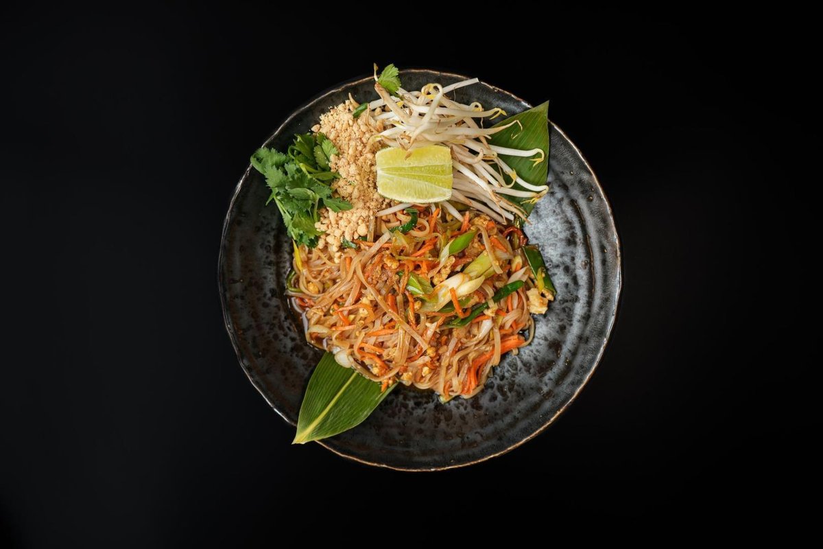 Tradiční thajské rýžové nudle,vejce, tamarind omáčka, zelenina, sójové výhonky, koriandr, arašídy