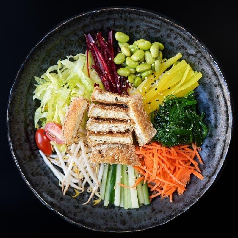 losos marinovaný v ponzu, edamame, fermentovaná ředkev, mrkev, cherry rajče, okurka, chuka wakame, salát, výhonky, sezam a prémiová japonská rýže v octovém nálevu sushi su a teriyaki sós