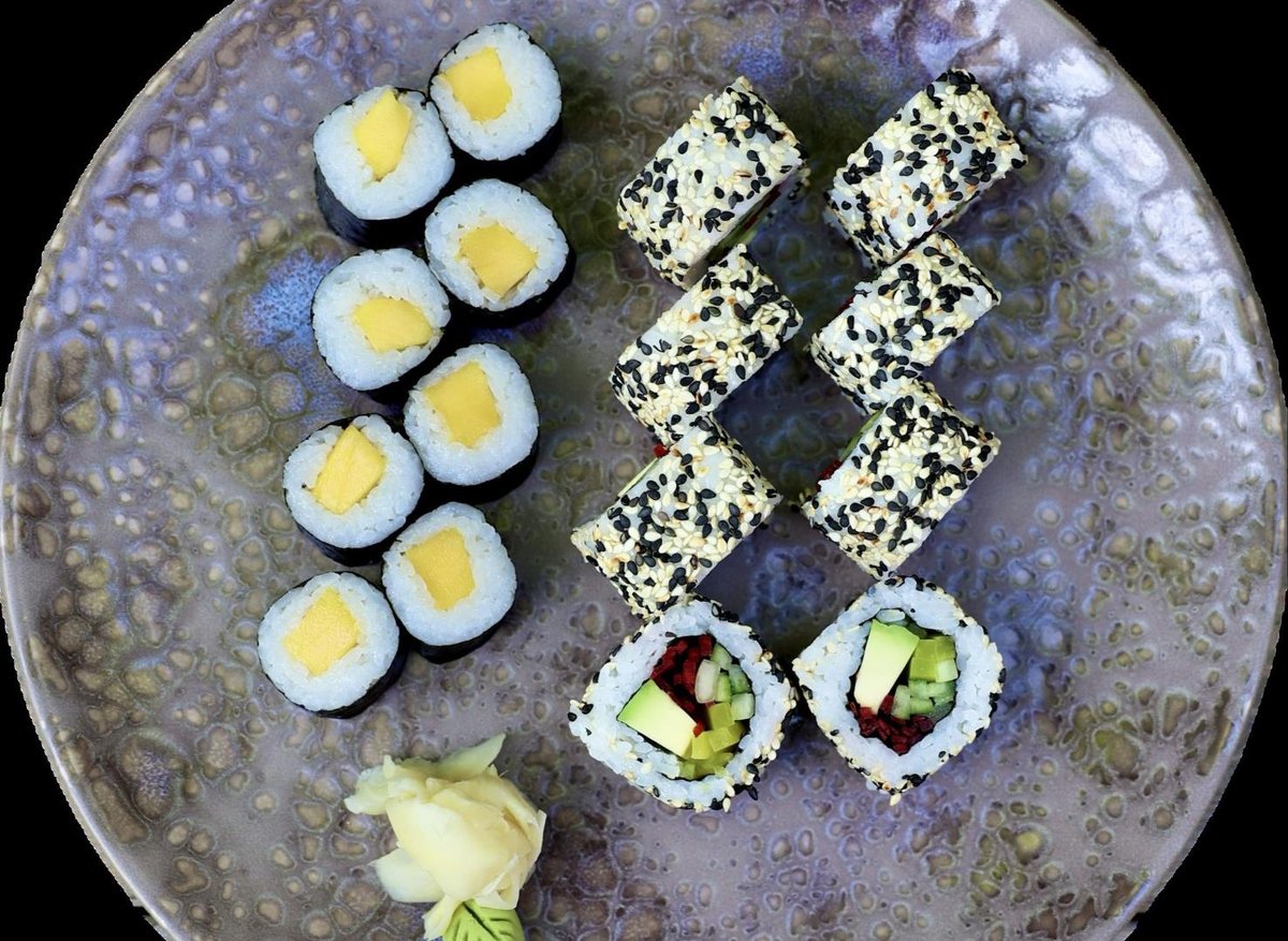 Maki Shiitake + Futto Maki Salmon Sushi + Mango Limonáda