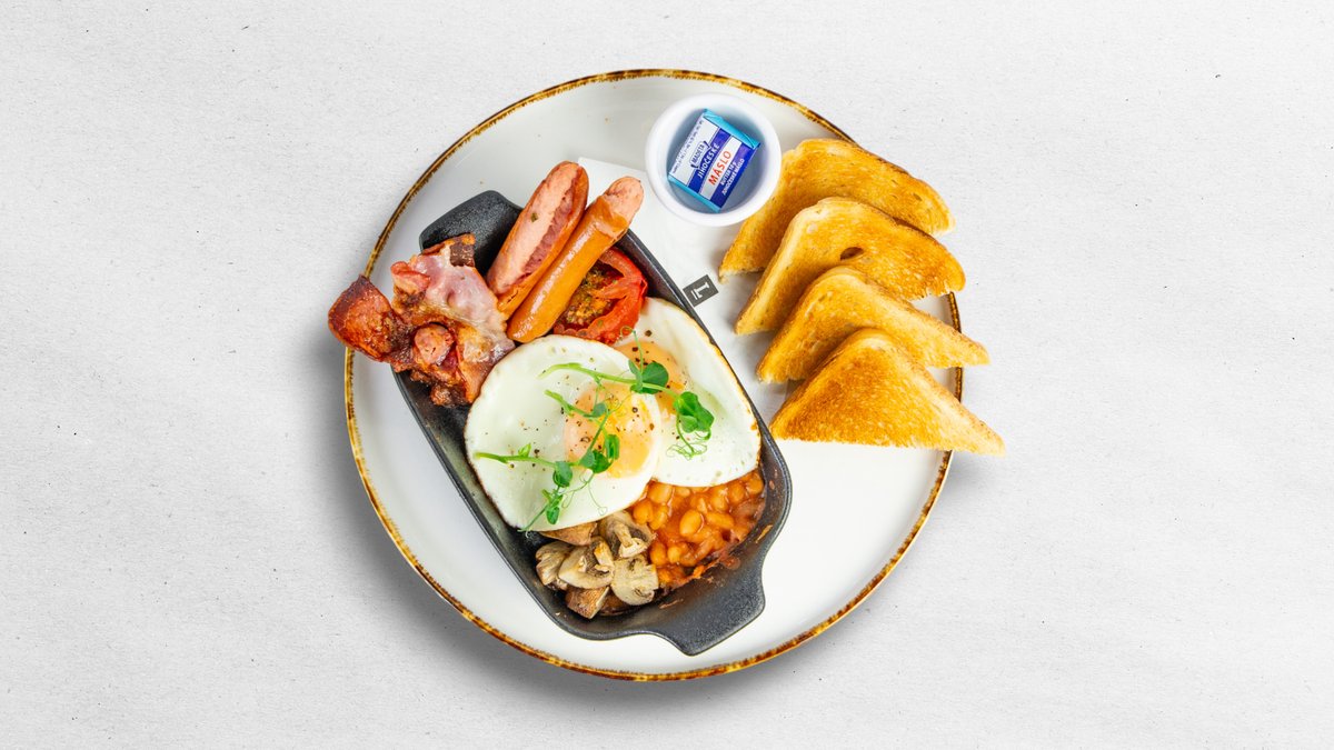 2 vejce na volské oko, Slanina, Rajče, Fazole, Párky, Rozpečený toust, Máslo