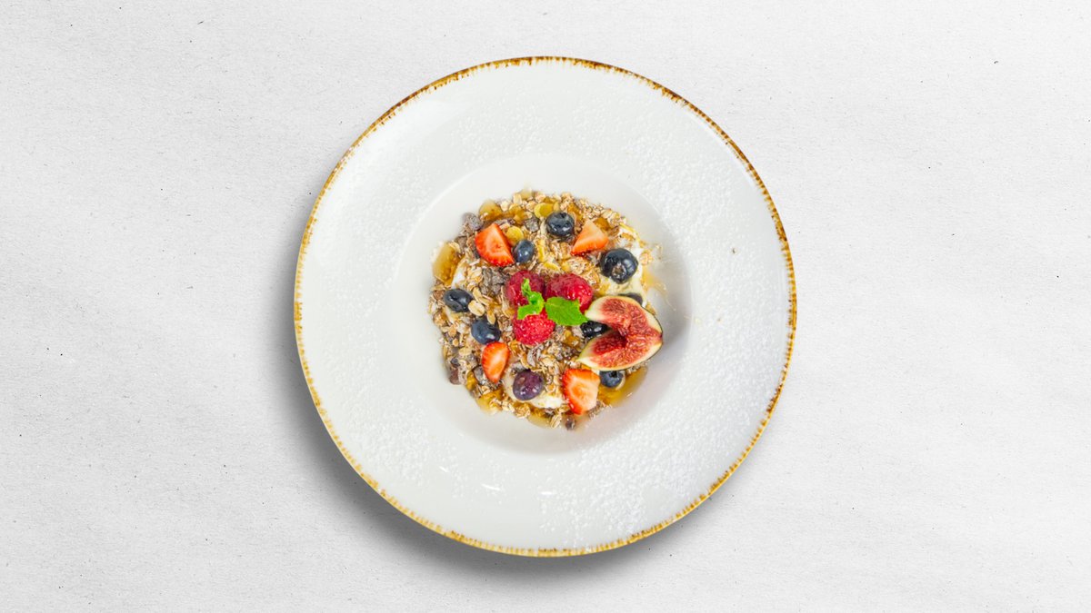 Musli s bílým řeckým jogurtem, Sezónní ovoce, Javorový sirup, Čerstvý džus 0,2 litru