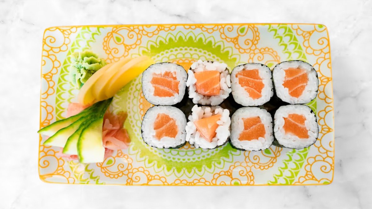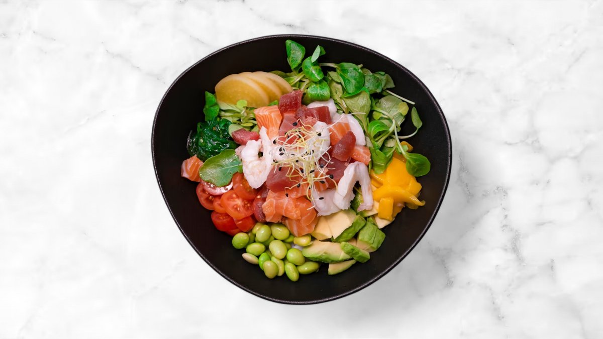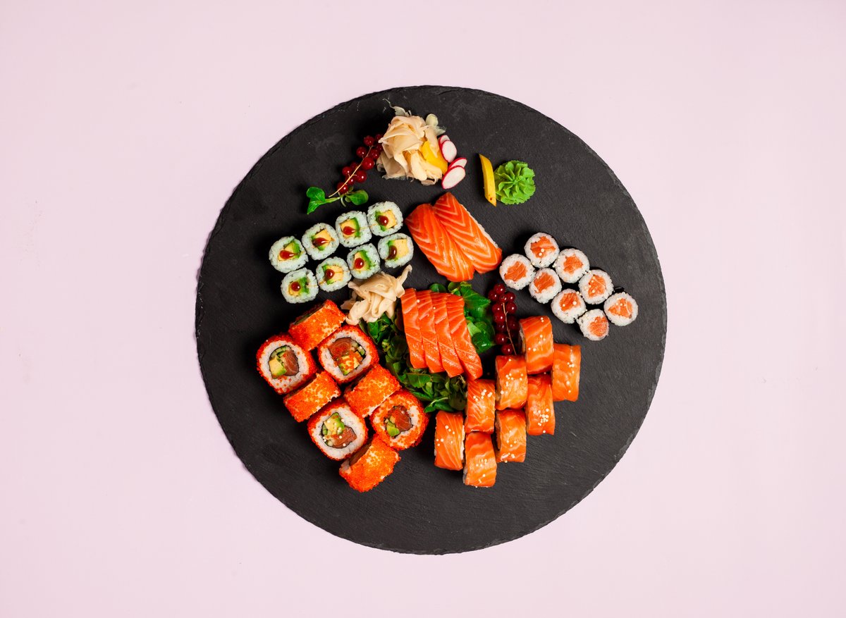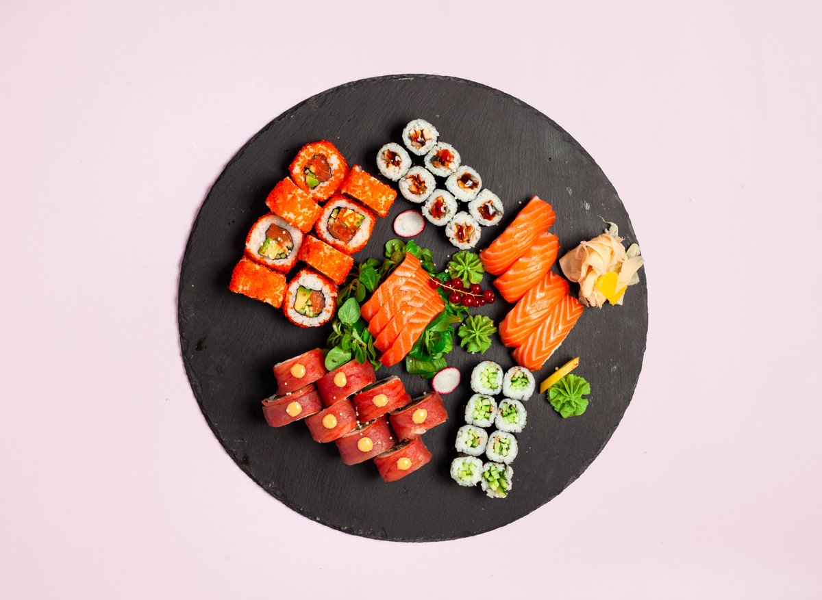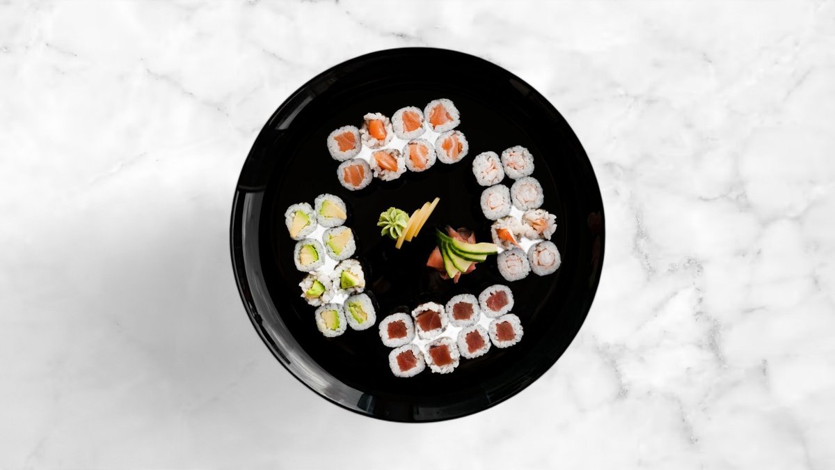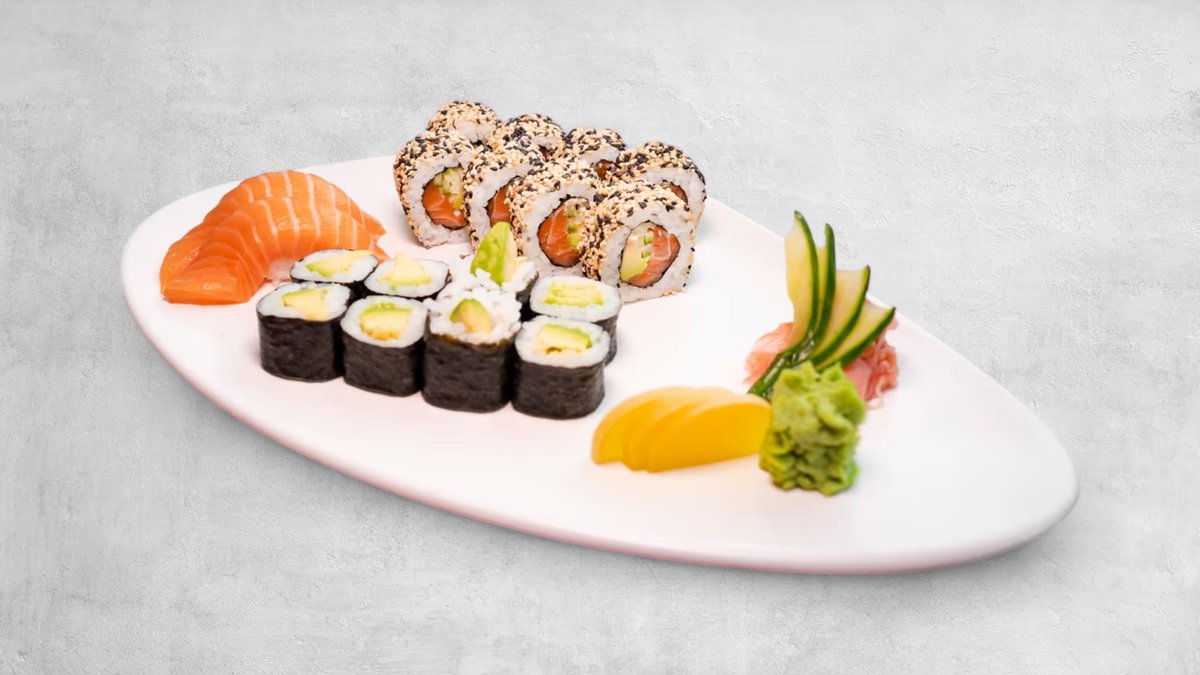 salmon, tuna, shrimp, tofu, edemame, mango, avocado, salad wakame, cucumber, oshinko, ginger