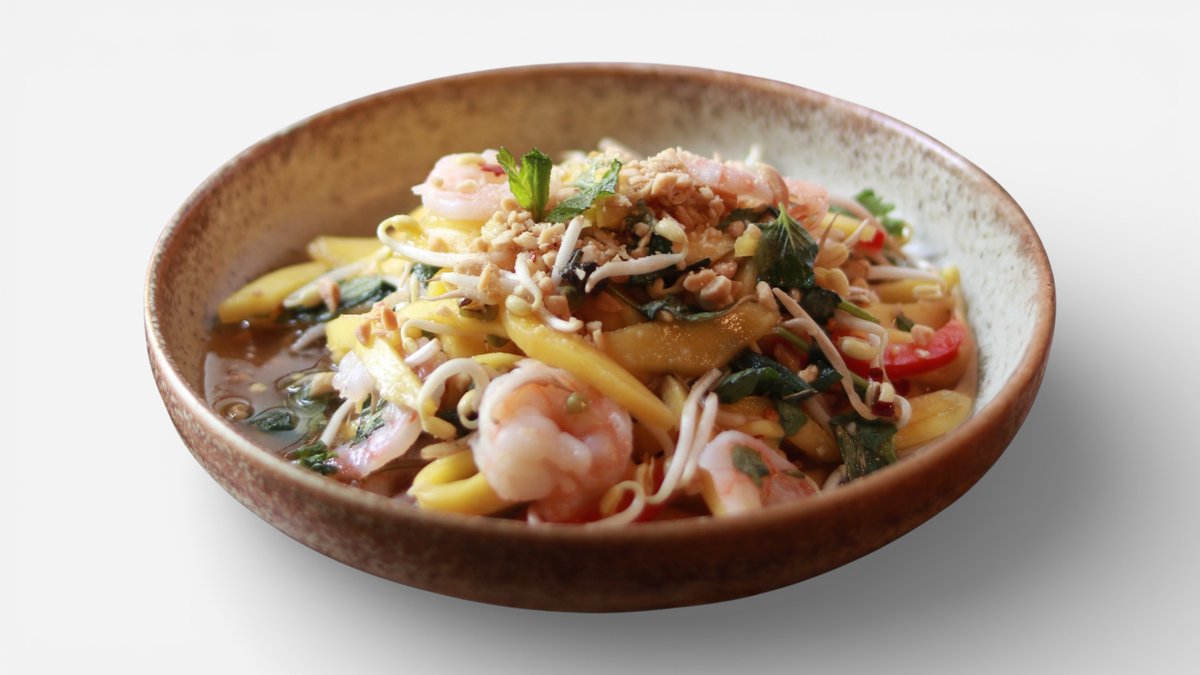 mangový salát, mungo klíčky, mrkev, okurka, červená paprika, čili, cherry rajčata, koriandr, arašídy, yuzu dresink