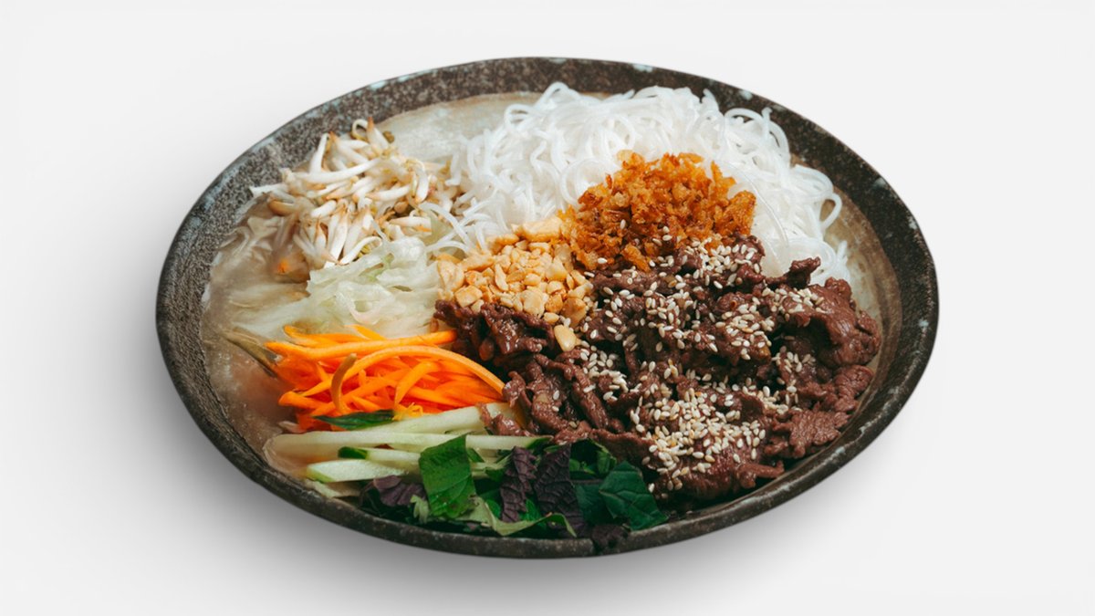 hovězí maso, rýžové nudle, salát, okurka, mrkev, sojové klíčky, sezonní bylinky, arašídy, smažená cibulka, sezam, rybí sladko-kyselá zálivka