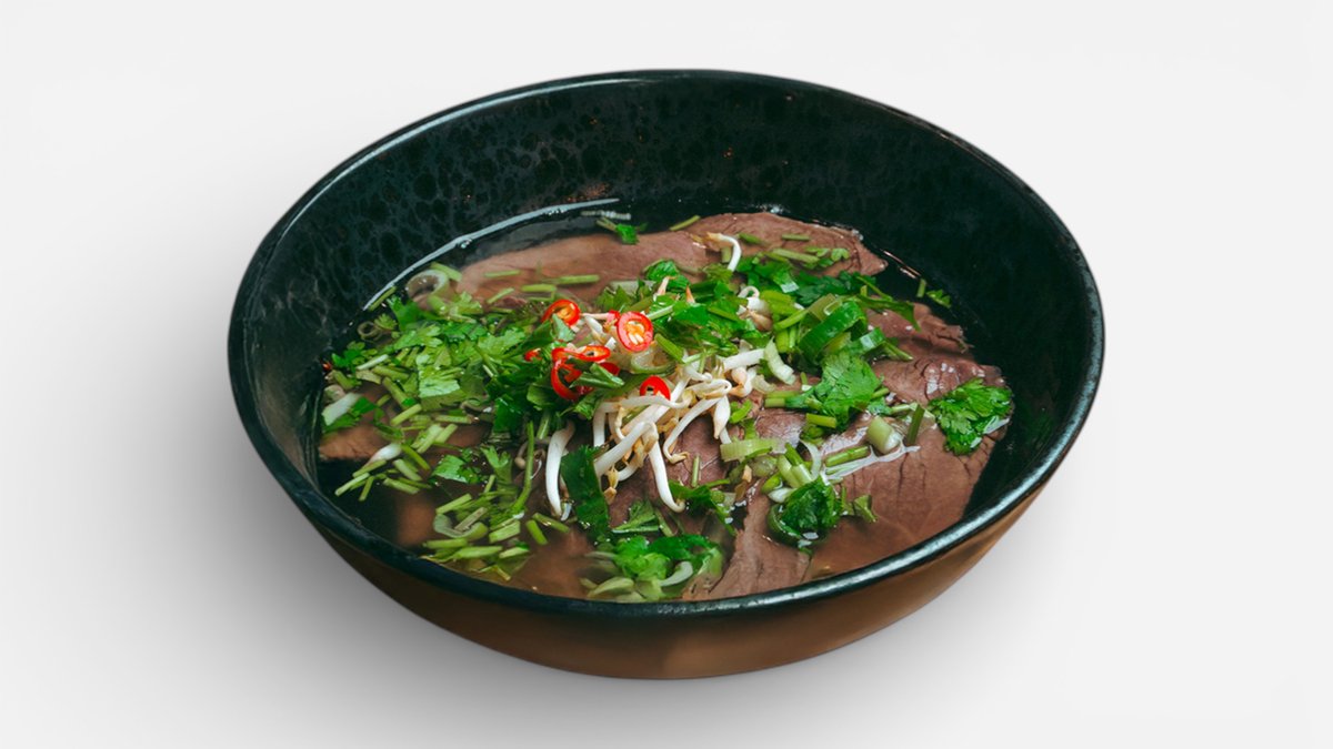 hovězí a kuřecí vývar, rýžové nudle, sojové klíčky, jarní cibulka, cibule, koriandr