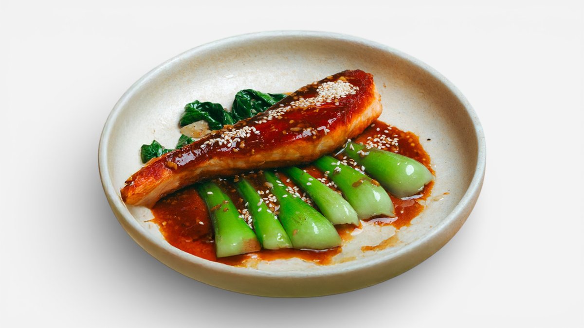 Grilovaný losos, teriyaki omáčka, pak choi, sezam