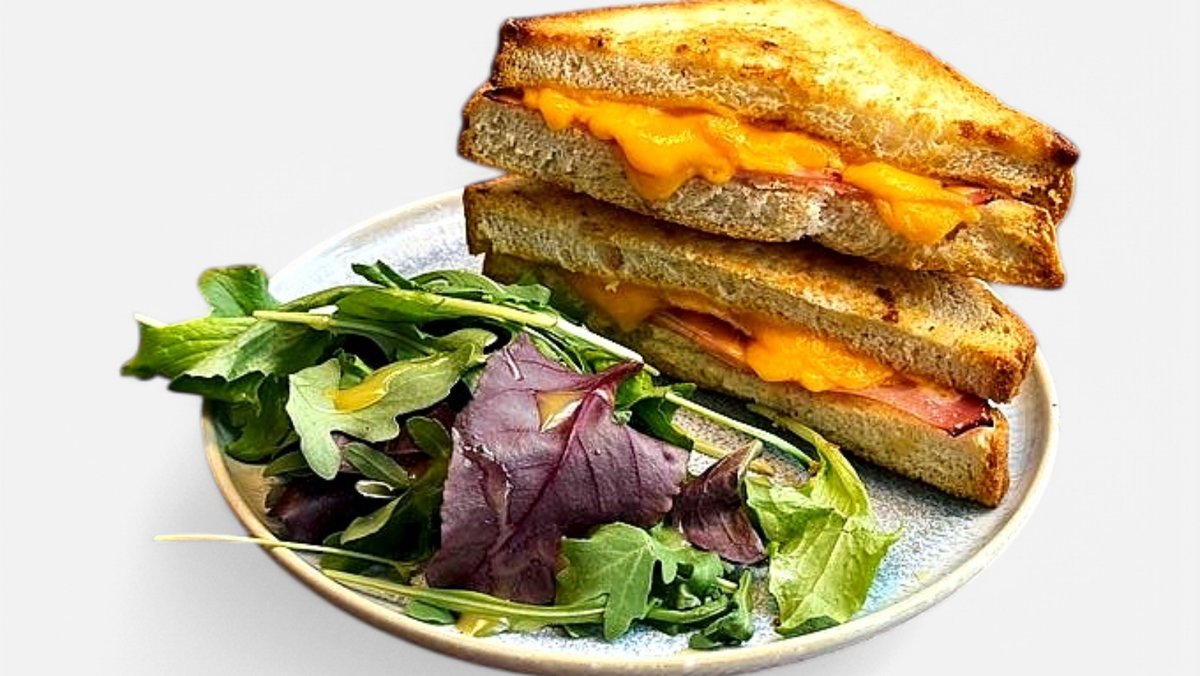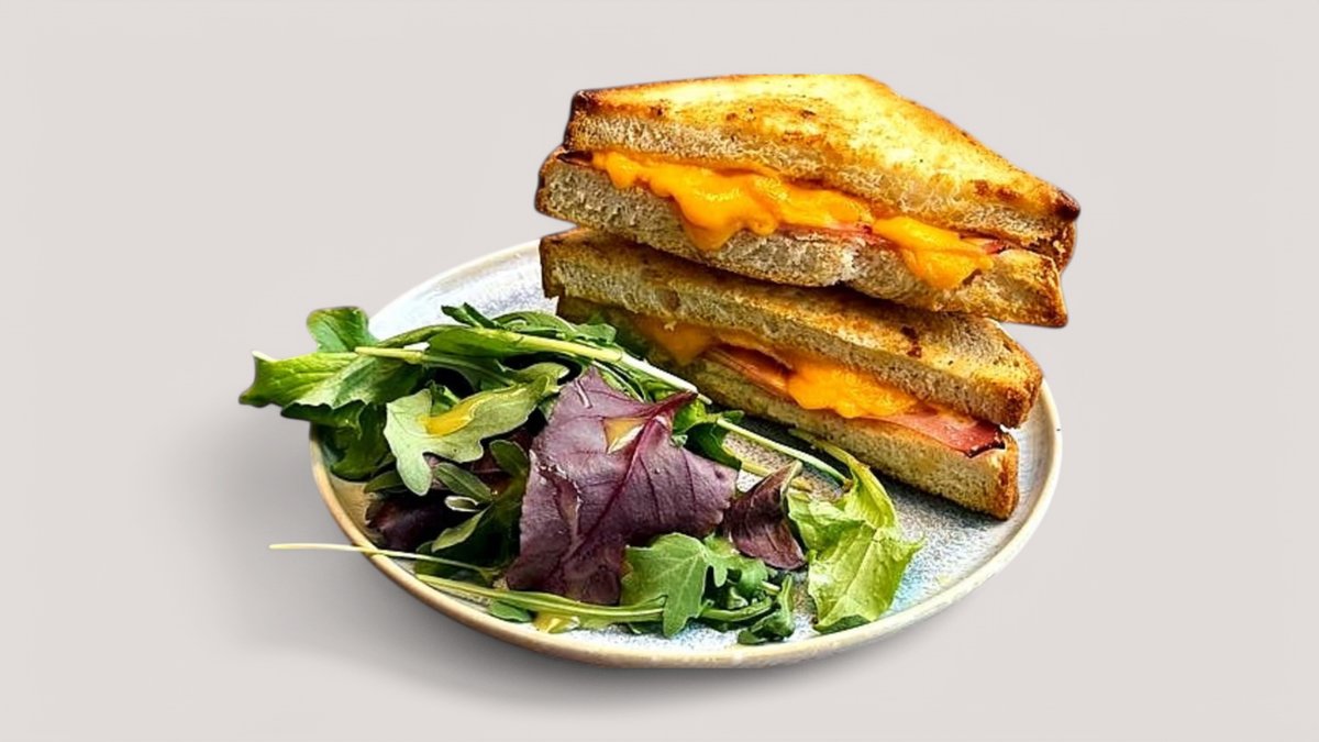 grilovaný sendvič s pražskou šunkou, cheddarem a slaninou, salátek (1,3,7)