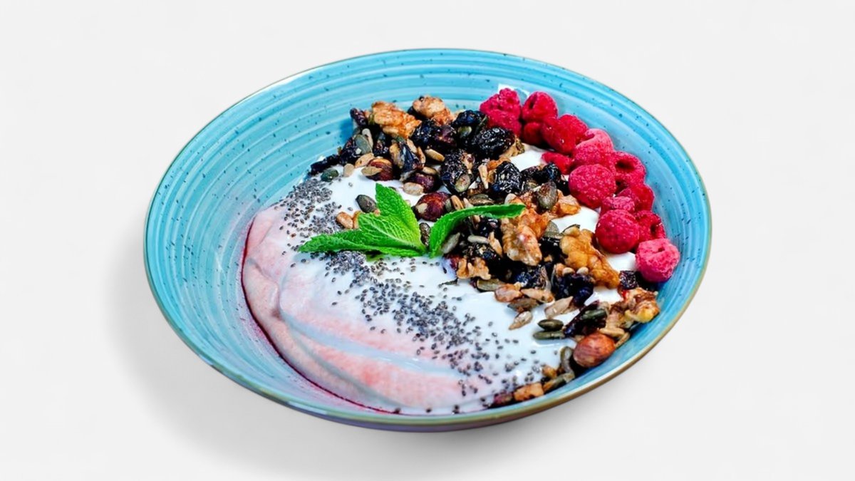 řecký jogurt, granola, chia semínka, maliny sušené mrazem, malinový prach (7)