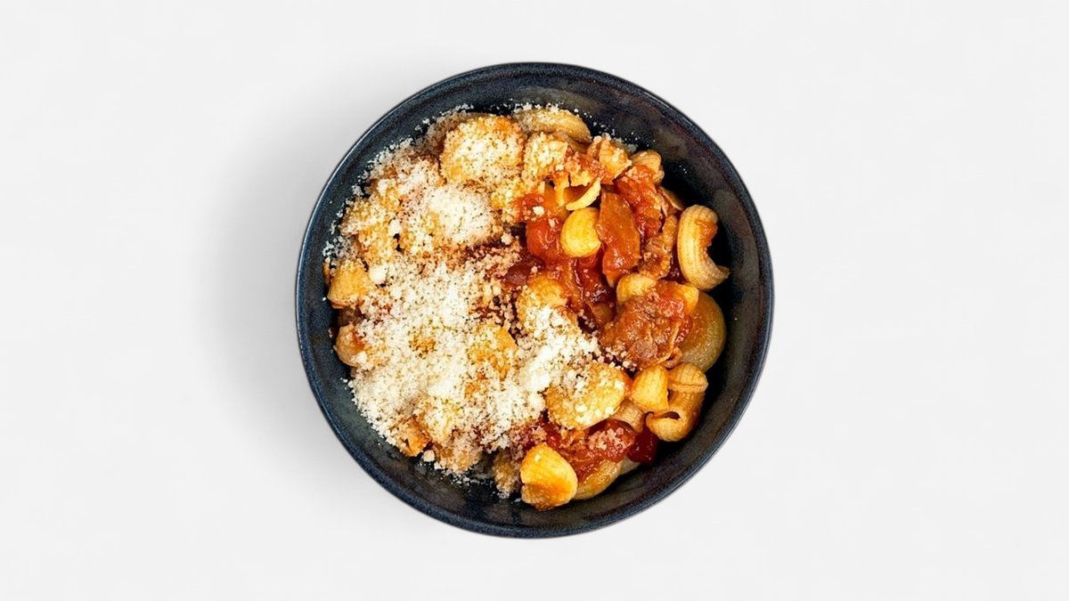 Čerstvé těstoviny Amatriciana z loupaných rajčat, pancetty, bílého vína, česneku a čerstvého chilli s parmazánem