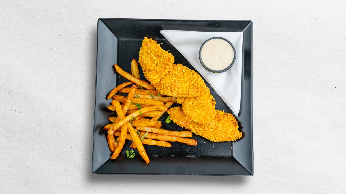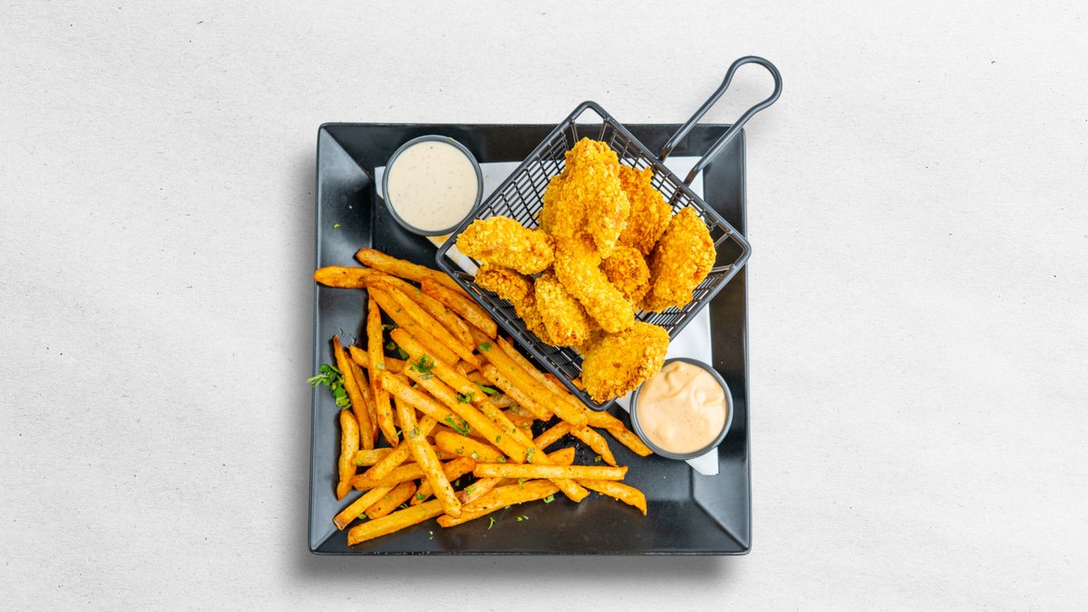 Kuřecí kousky obalené v naší strouhance, s domácími hranolkami a dipem dle výběru