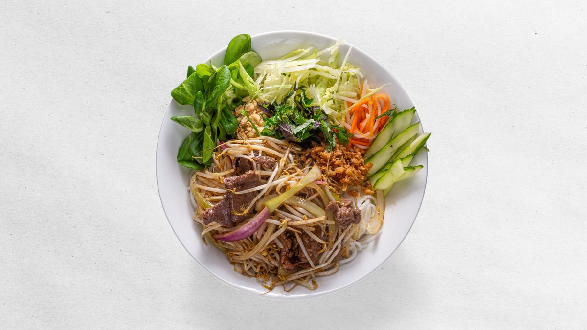 Restované hovězí maso s rýžovými nudlemi, salátem, bylinkami a rybí omáčkou