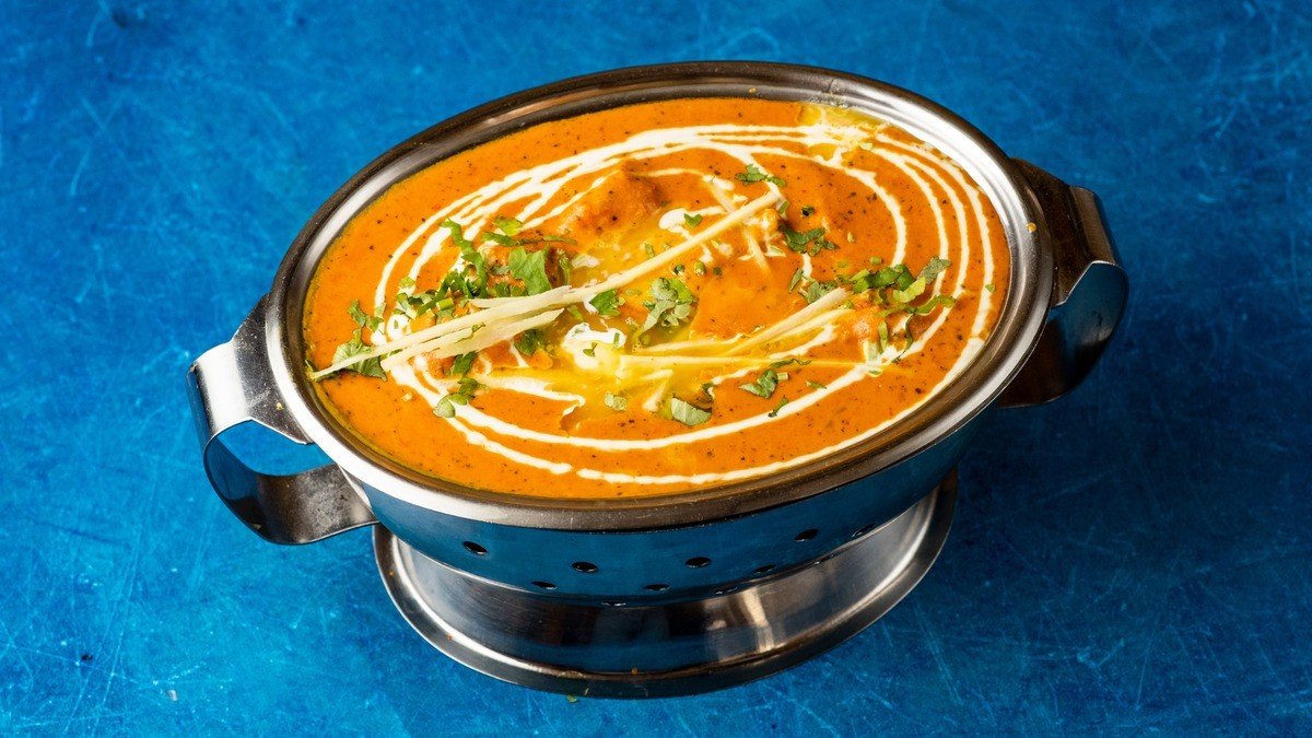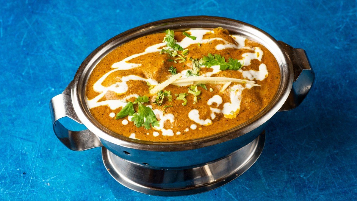 vykostěné kousky kuřete (tikka) v krémové rajčatové omáčce, s pastou z kešu ořechu, ochucené s na slunci sušenou pískavicí, zázvorem, kardamonem, dochucené máslem a smetanou