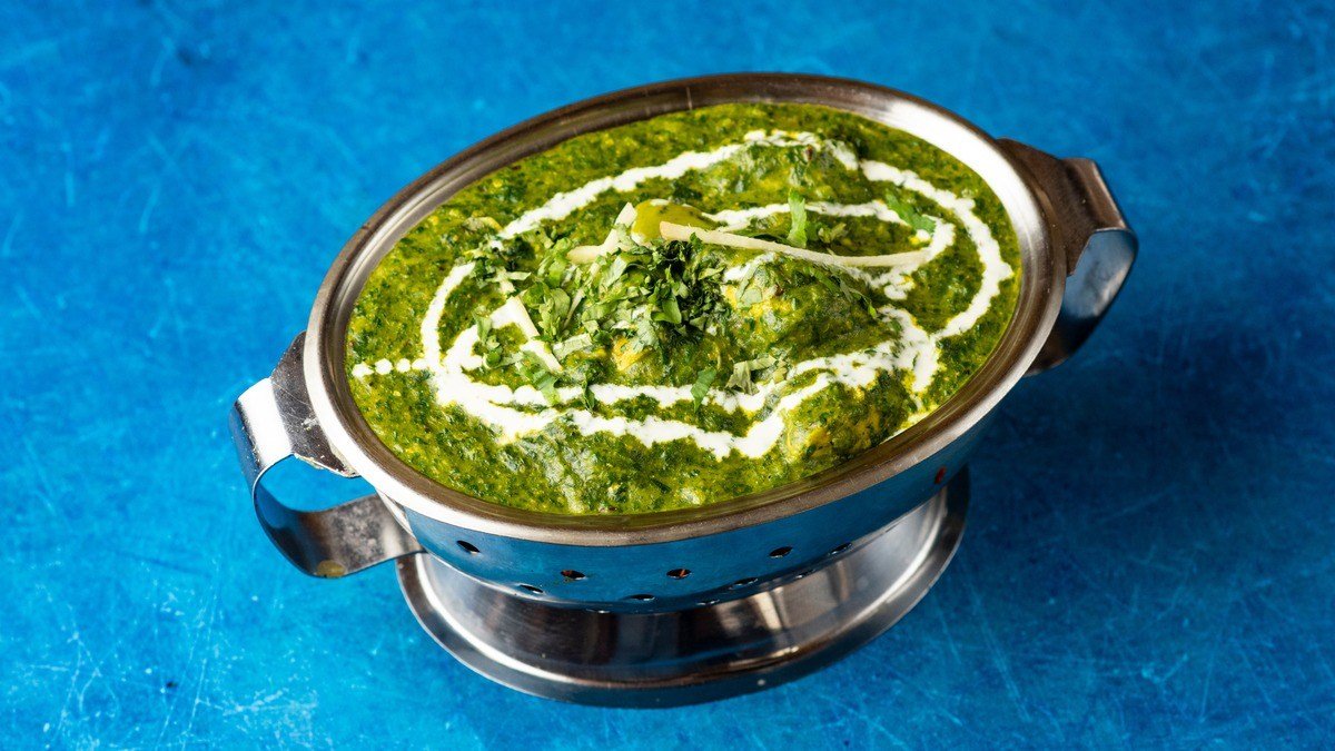 kousky jehněčího masa s čerstvým špenátem, vařené s česnekem, zázvorem, kmínem, pískavicí, dochucené speciální indickou smetanou a desi ghee (speciální indické máslo)
