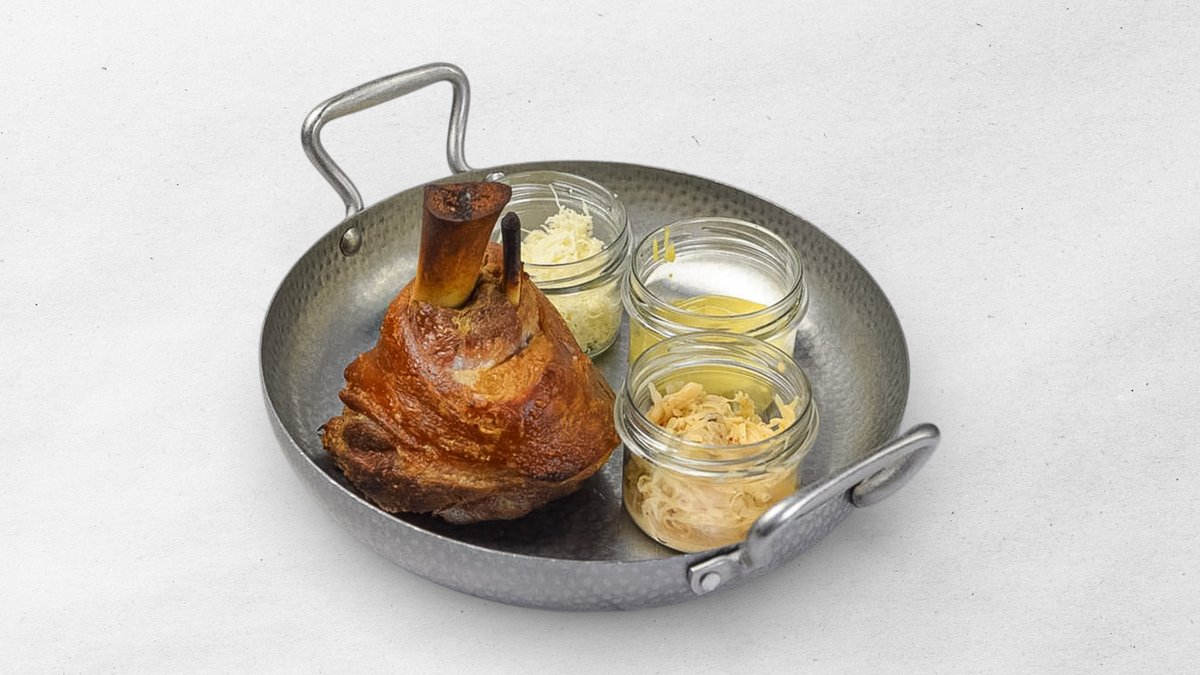 500g marinovaná a pečená s naším pivem, kandovaná slanina, perlové cibulky, jablečná bbq omáčka, náš zelný salát s křenem, opečená česneková brioška